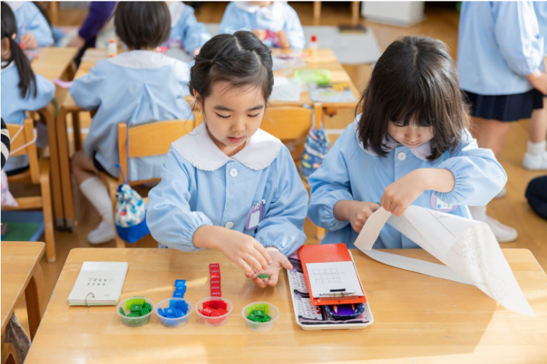 子どもの発育に沿った教育法が組み立てられています。手で触れられる具体物を使って、数の世界の法則性に出会いながら、数える喜びがわかり、同時に論理的に物事を考える基礎を培います。