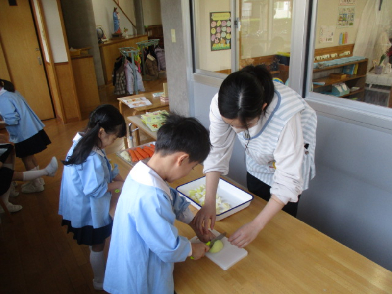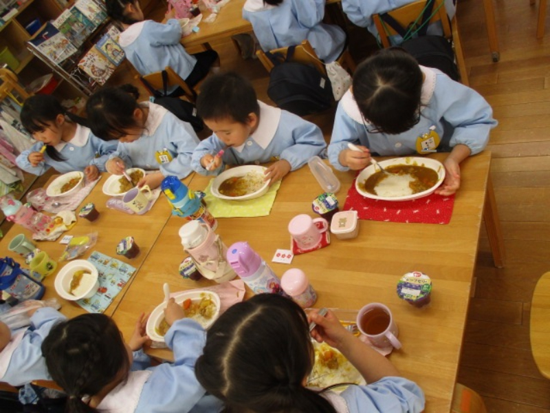 2026.02.27 New お別れカレー会 今日は役員の皆さんにお手伝い頂いて、お別れカレー会を行いました。A組さんは人参とじゃが芋を切るお手伝いをしました。幼稚園の花壇で園芸ボランティアさんと育てた人参・じゃが芋・玉ねぎも収穫して、一緒に煮込みました。幼稚園中がカレーの良い匂いでいっぱいになりました。みんなで作ったカレーは格別においしかったです。デザートのぶどうゼリーも嬉しかったですね。お手伝いをしていただきましたお母さま方、ありがとうございました。 ※クリックすると拡大して表示されます